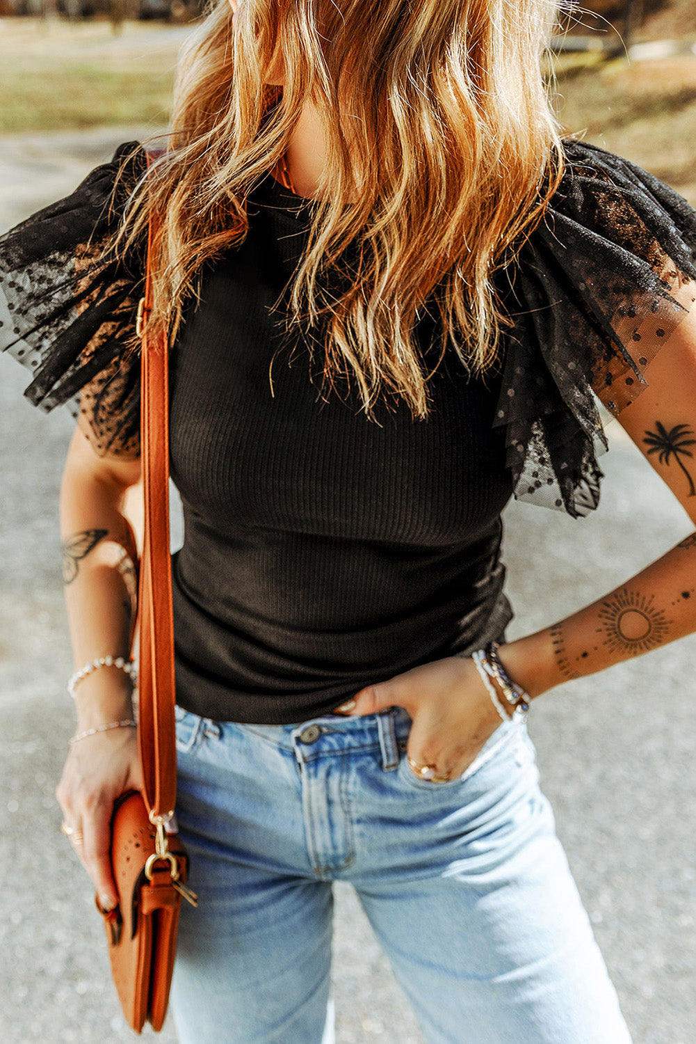 Black Dotty Mesh Ruffle Sleeve Ribbed Knit Top
