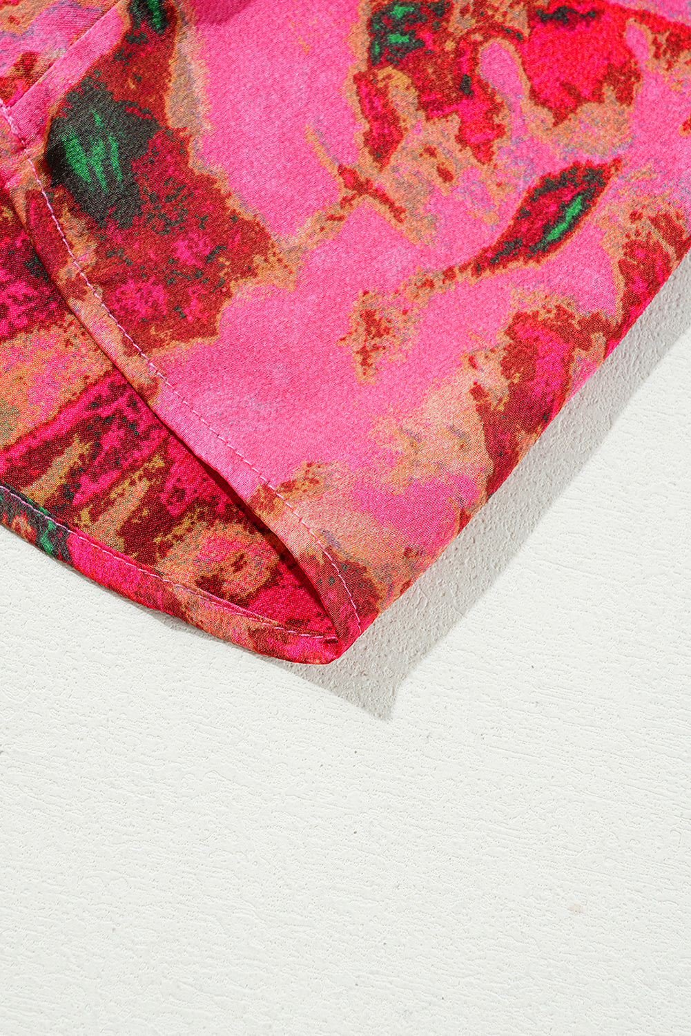 • This blouse top is attention-getting with an abstract print and a glowing hue.